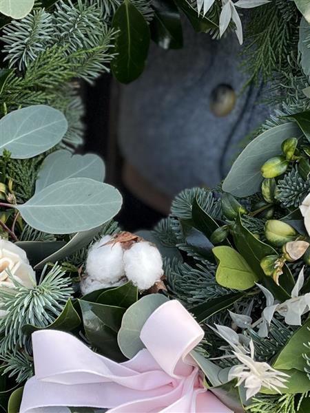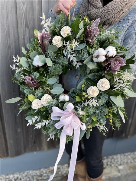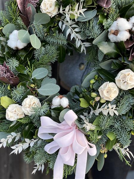 A beautiful Christmas wreath with a hint of pink.