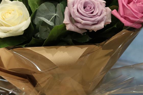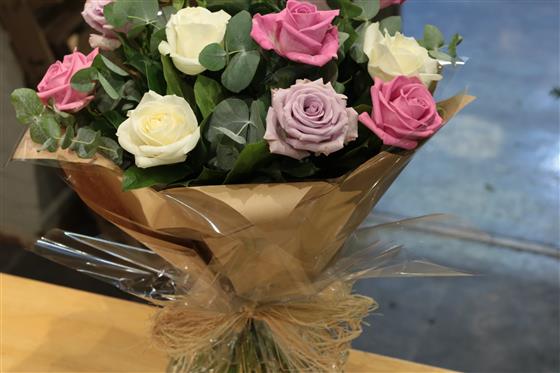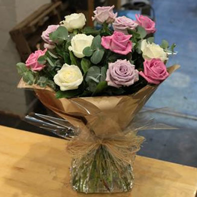 A dozen pretty mixed pink, lilac and ivory roses presented with a selection of foliage presented in water.